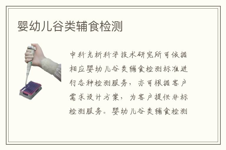 中科光析科學(xué)技術(shù)中析研究所可依據(jù)相應(yīng)嬰幼兒谷類輔食檢測(cè)標(biāo)準(zhǔn)進(jìn)行各種檢測(cè)服務(wù),亦可根據(jù)客戶需求設(shè)計(jì)方案,為客戶提供非標(biāo)檢測(cè)服務(wù)。嬰幼兒谷類輔食檢測(cè)費(fèi)用需結(jié)合客戶檢測(cè)需求以及實(shí)驗(yàn)復(fù)雜程度進(jìn)行報(bào)價(jià)。一般7-15個(gè)工作日可出具檢測(cè)報(bào)告。 ```html嬰幼兒谷類輔食檢測(cè)是指對(duì)嬰幼兒食用的谷物制品進(jìn)行一系列質(zhì)量和安全評(píng)估的過程。這項(xiàng)正規(guī)檢測(cè)旨在確保市售的嬰幼兒谷類輔食符合食品安全標(biāo)準(zhǔn),保障嬰幼兒的健康和營(yíng)養(yǎng)需求。