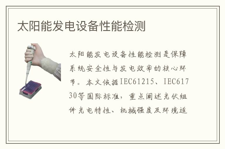 關(guān)鍵詞:太陽能發(fā)電設(shè)備性能測試標準,太陽能發(fā)電設(shè)備性能項目報價,太陽能發(fā)電設(shè)備性能測試案例