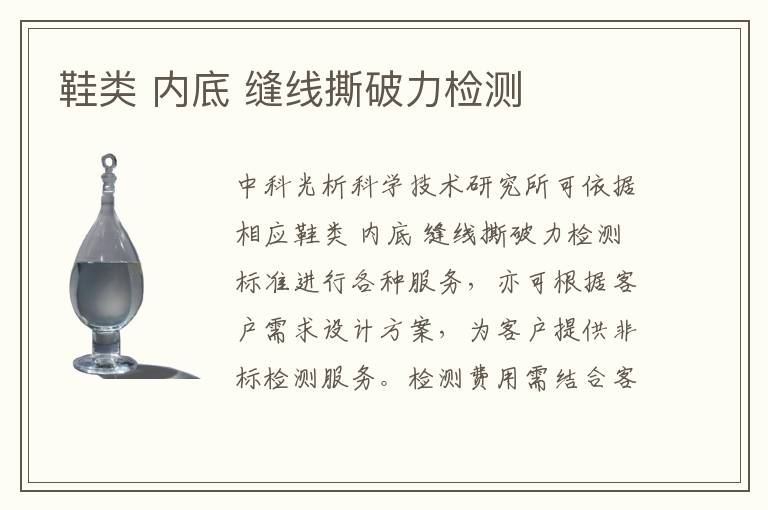 鞋類內(nèi)底縫線撕破力檢測是一項(xiàng)關(guān)鍵的質(zhì)量控制過程,用于評估鞋類產(chǎn)品的耐用性和可靠性。這一檢測主要關(guān)注鞋內(nèi)底與縫線的結(jié)合強(qiáng)度,確保在日常使用中,即使在承受重壓或其他外力作用時,鞋內(nèi)底不會發(fā)生撕裂或脫落。這對于保證消費(fèi)者的使用安全和提升產(chǎn)品的整體質(zhì)量至關(guān)重要。