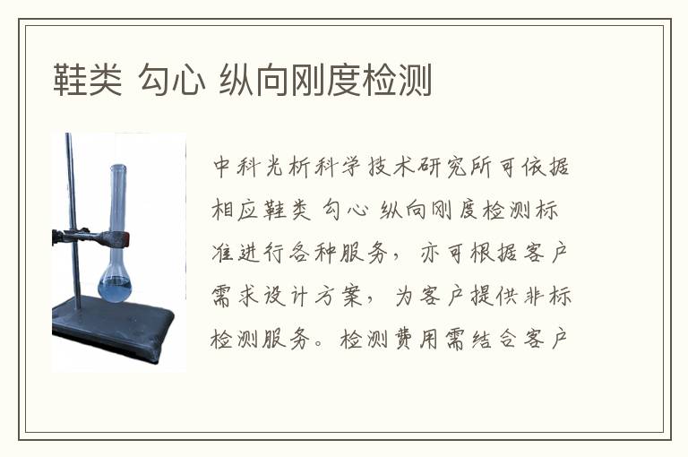 鞋類(lèi)勾心是鞋履結(jié)構(gòu)中的關(guān)鍵部件,它連接鞋跟和鞋底,為鞋子提供支撐和穩(wěn)定性。縱向剛度是指勾心在垂直方向上抵抗彎曲的能力,這一指標(biāo)對(duì)于評(píng)估鞋子的舒適度和耐用性至關(guān)重要。本文將詳細(xì)介紹勾心縱向剛度的檢測(cè)范圍、檢測(cè)項(xiàng)目、檢測(cè)方法以及使用的檢測(cè)儀器和服務(wù)優(yōu)勢(shì)。