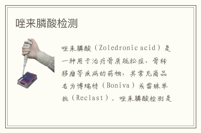 唑來膦酸(Zoledronic acid)是一種用于治療骨質(zhì)疏松癥、骨轉(zhuǎn)移瘤等疾病的藥物,其常見商品名為博瑞特(Boniva)或雷珠單抗(Reclast)。唑來膦酸檢測是指通過檢測體內(nèi)唑來膦酸的濃度,來監(jiān)測患者對藥物的代謝情況和療效。