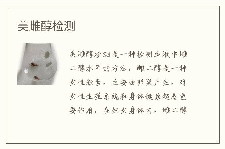 美雌醇檢測是一種檢測血液中雌二醇水平的方法。雌二醇是一種女性激素,主要由卵巢產(chǎn)生,對女性生殖系統(tǒng)和身體健康起著重要作用。在婦女身體內(nèi),雌二醇的水平通常會隨著月經(jīng)周期和年齡的變化而波動。