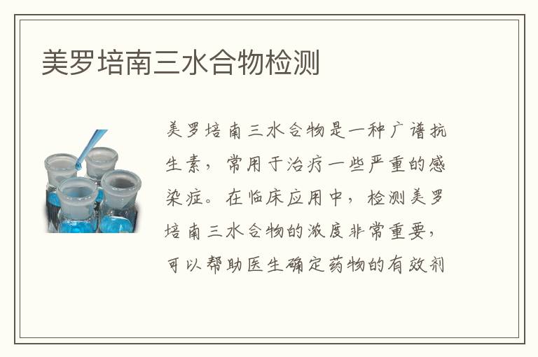 檢測美羅培南三水合物的濃度通常通過血液樣本或者尿液樣本進行。這些樣本會被送到正規(guī)的實驗室進行分析,并且在臨床實驗中往往需要借助高性能液相色譜質譜聯(lián)用技術等先進儀器來進行分析。